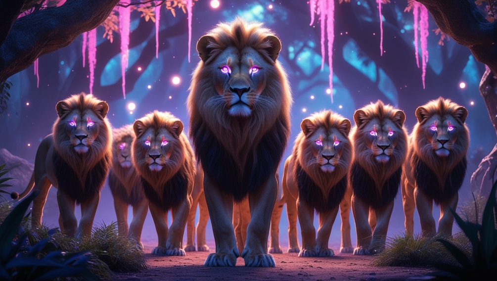 This stunning digital artwork features a majestic lion at the heart of a neon-lit dreamscape, surrounded by its powerful pride. Its galaxy-filled eyes radiate cosmic energy, reflecting the mysteries of an ethereal jungle where glowing vines, bioluminescent crystals, and swirling neon mist come to life.